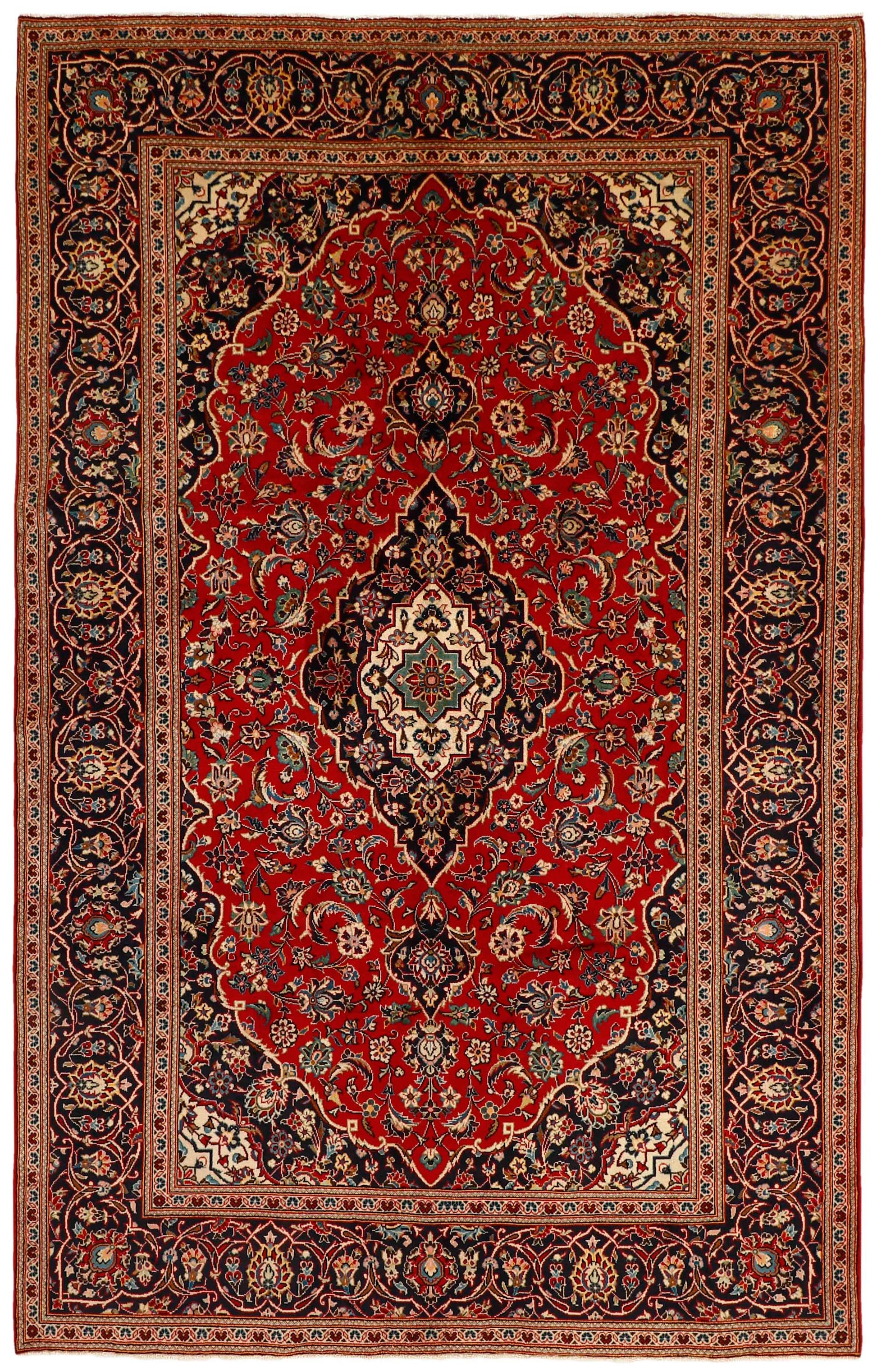 The patterns are most commonly woven around a medallion in the centre of the rug, some of which are repeated in the corners. The other fields are densely decorated with realistic flowers and vines. The main border often features the "Herati" motif (an arched leaf), while the secondary borders feature rosettes. Brick red and dark blue are the most common base colours. Keshan is a city of about 300.000 people, situated in the Isfahan province in central Iran.